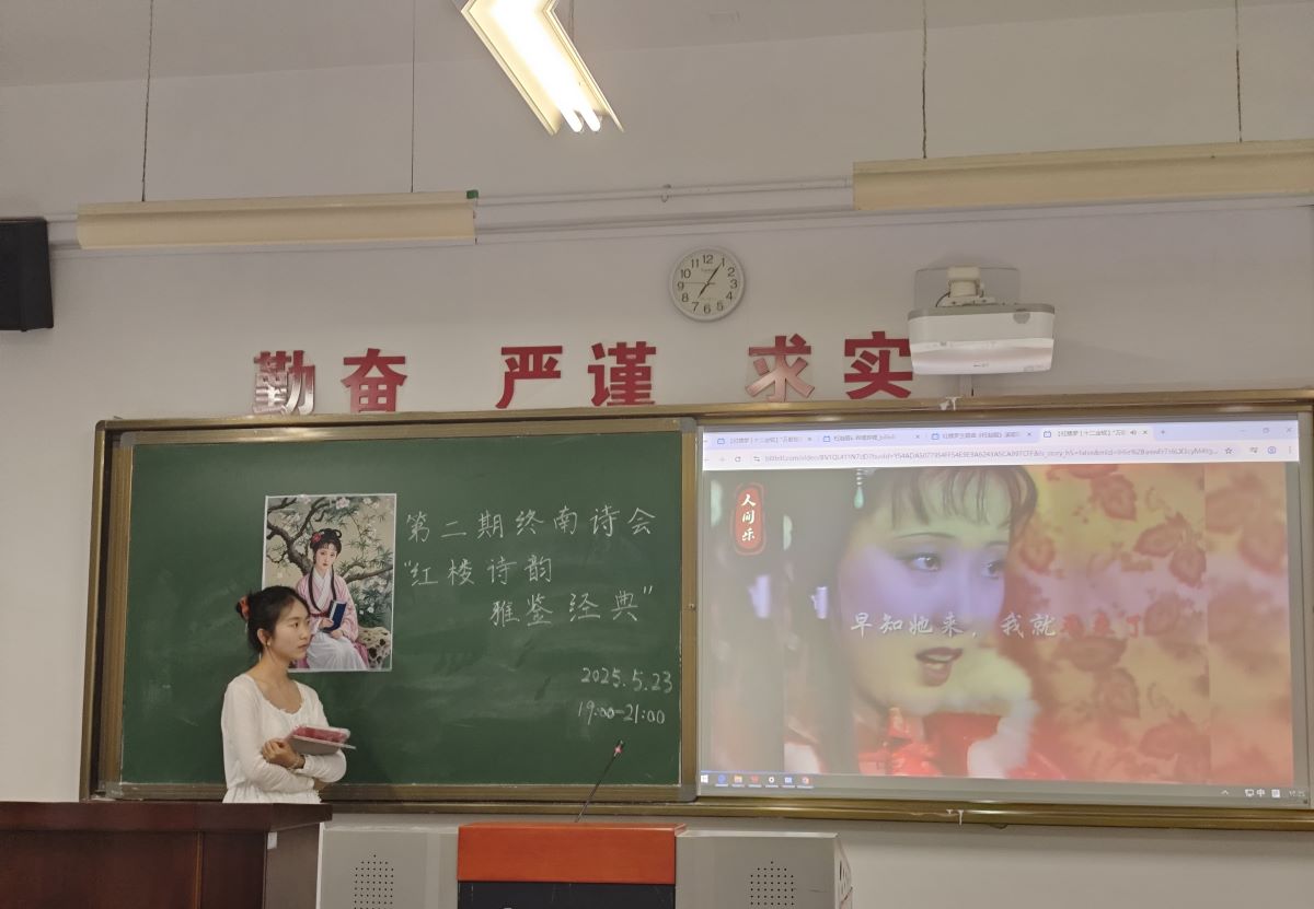 初夏时节,万物并秀,5月25日晚,js333国际线路终南诗社于长安校区1201教室成功举办了第十三届“抒雁杯”青春诗会系列活动之第二期终南诗会。本次诗会以“红楼诗韵,雅鉴经典”为主题,以红楼梦诗词赏析展示等形式,带领现场同学们于红楼诗词中观察各不相同的人生样态,品味典雅生香的诗文韵味。来自不同院系的本科生、研究生共计30余人参加了此次活动。活动由终南诗社李思诺同学主持。