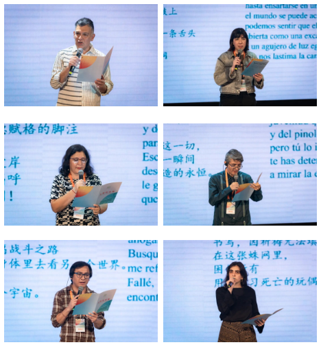 拉美诗人代表巴勃罗·霍夫雷,维多利亚·拉米雷斯·曼西利亚,劳里·加西亚·杜埃尼亚斯,罗伯托·阿库尼亚,阿德里安·门迭塔·莫克特苏马,丽格娜·拉莫斯分别以《自我沉湎》《花粉理论》《痛》《正午》《避难》《面包屑》《蛛网》为题进行原创诗歌朗诵。中国诗人代表王子瓜、吴越、尹东在、周文婷、茱萸、左右分别以《入图》《临湖晚帖》《被母亲劝解过的人世》《从风滚草开始》《立春》《听声》为题进行了朗诵。
