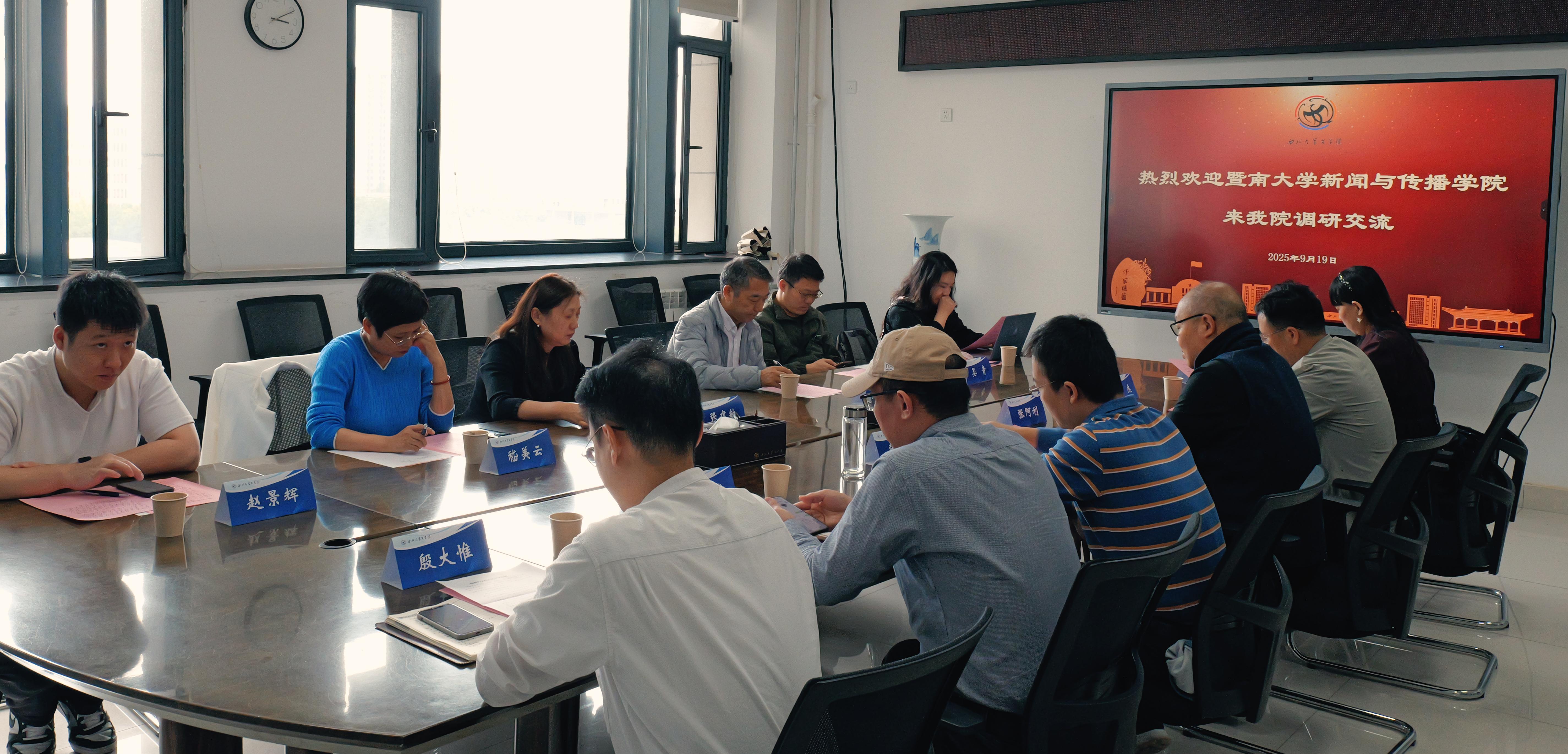 9月19日,暨南大学新闻与传播学院来我院调研交流,座谈会在长安校区js333国际线路第二会议室召开。参加会议的来宾有暨南大学新闻与传播学院院长支庭荣教授、党委副书记张建敏教授、副院长晏青教授、嵇美云教授、黄雅堃副教授和辅导员赵景辉老师。电影学院院长、js333国际线路副院长张阿利教授,js333国际线路党委副书记陈柯,社科处副处长、js333国际线路教师李有军教授,院长助理、广播电影电视系主任巩杰教授,电影学教研室主任赵涛副教授,院团委副书记殷大惟参加了会议。会议由张阿利主持。